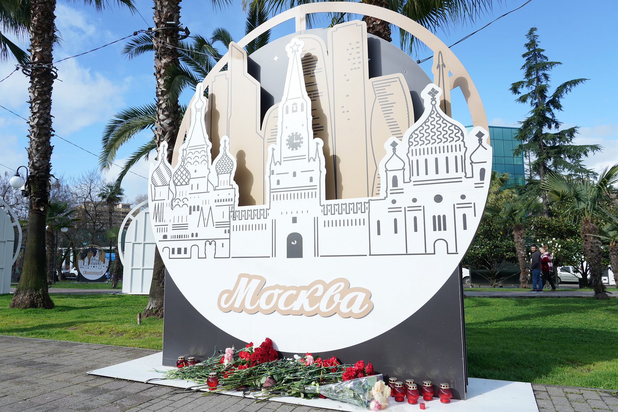 На улице Навагинской напротив железнодорожного вокзала установлены малые архитектурные формы с названиями городов России, символизирующие единство и солидарность нашего государства. С утра у подножия «Москвы» образовался стихийный мемориал.