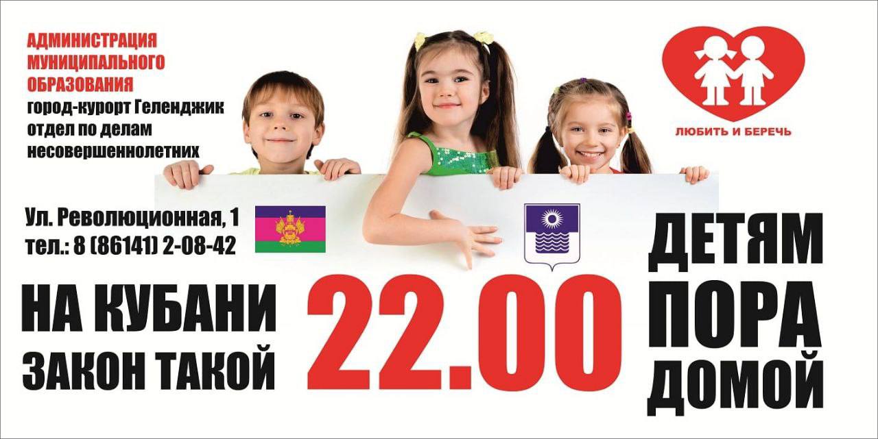 22.00 - детям пора домой! Отдел по делам несовершеннолетних напоминает, что на территории Краснодарского края действует закон, направленный на обеспечение безопасности и благополучия детей.