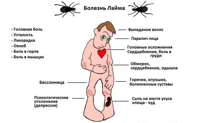 Признаки клещевого боррелиоза: инкубационный период составляет - от 2 до 30 дней, в среднем - 2 недели. Характерным признаком начала заболевания в 70% случаев является появление на месте укуса клещом покраснения кожи. Красное пятно постепенно увеличивается по периферии, достигая 1-10 см в диаметре, иногда до 60 см и более – так называемая клещевая мигрирующая эритема – единственный признак острого периода, без лечения сохраняется 2-3 недели, затем исчезает. Но чаще пятну сопутствуют другие проявления заболеваний: увеличение региональных групп лимфоузлов, недомогание, мышечные боли, боли в суставах и лихорадка (обычно невысокая, но может достигать +39-40ºC), затем на четвертой неделе болезни (от 1 до 10 недель) появляются неврологические и сердечнососудистые осложнения.