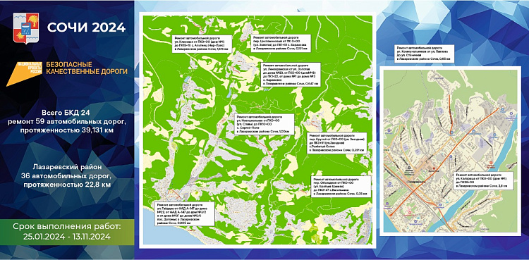 В рамках национального проекта «Безопасные качественные дороги» в 2024 году по всей территории города Сочи запланирован ремонт 59 автомобильных дорог. Их общая протяженность более 39 километров.